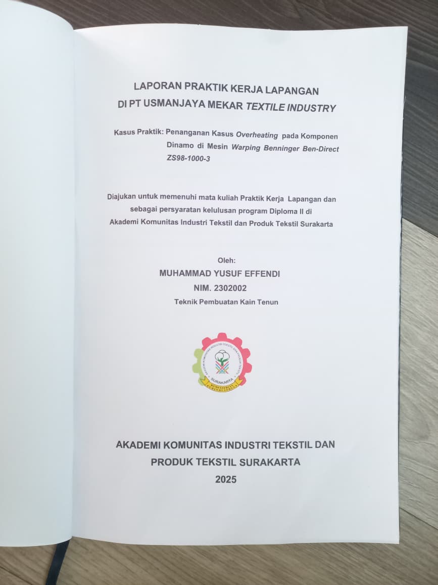 Laporan ini disusun berdasarkan Praktik Kerja Lapangan (PKL) di PT Usmanjaya Mekar Textile Industry, khususnya pada Departemen Persiapan, yang memiliki peran penting dalam menentukan kualitas produksi kain tenun. Salah satu proses utama di dalamnya adalah penghanian (warping), yang menggunakan mesin Warping Benninger Ben-Direct ZS98-1000-3. Selama PKL, ditemukan permasalahan overheating pada dinamo mesin warping, yang memengaruhi kelancaran proses produksi. PT Usmanjaya Mekar Textile Industry (PT Usmantex) adalah perusahaan yang bergerak di bidang pembuatan kain tenun (grey). Perusahaan ini memiliki berbagai departemen dan mesin produksi, termasuk 4 unit mesin warping. Departemen persiapan, tempat dilaksanakannya PKL, merupakan titik awal proses produksi. Mesin yang menjadi fokus dalam laporan ini adalah mesin Warping Benninger Ben-Direct ZS98-1000-3 (Warping 4). Bagian produksi mencakup perencanaan, proses produksi, pemeliharaan mesin, dan pengendalian mutu. Mesin warping berperan penting dalam proses awal penggulungan benang lusi. Tata letak mesin yang efisien di Departemen Persiapan mendukung kelancaran alur produksi. Perawatan dan perbaikan mesin menjadi langkah penting untuk menjaga performa, termasuk pencegahan kerusakan pada sistem pelumasan dan pendinginan, seperti oil pump. Masalah utama yang ditemukan adalah terjadinya panas berlebih (overheating) pada dinamo mesin Warping 4, yang disebabkan oleh gangguan sirkulasi oli, khususnya pada oil pump. Tujuan penelitian ini adalah untuk mengetahui faktor yang menyebabkan terganggunya sirkulasi oli pada oil pump sehingga mengakibatkan overheating pada dinamo mesin dan melakukan penanganan terhadap terganggunya sirkulasi oli pada oil pump sehingga mengakibatkan overheating pada dinamo mesin Warping 4. Hasil analisis data Januari–Maret 2025 menunjukkan 12 jenis kerusakan terkait oil pump. Penyebab utama adalah kebocoran pada jalur solenoid, komponen seal dan gasket yang aus, serta sistem pelumasan yang kurang terawat. Penanganan dilakukan dengan metode 5W+1H, termasuk pemeriksaan menyeluruh, penggantian komponen rusak, dan pengujian ulang sistem. Setelah dilakukan perbaikan pada April 2025, frekuensi kerusakan menurun drastis, dan gangguan overheating tidak lagi muncul hingga Juni 2025. Dapat disimpulkan bahwa gangguan sirkulasi oli pada oil pump menjadi penyebab utama overheating pada dinamo mesin Warping 4. Penanganan yang dilakukan terbukti efektif menurunkan frekuensi kerusakan. Oleh karena itu, perusahaan disarankan untuk melakukan perawatan rutin, pemeriksaan berkala sistem oli, serta penggantian komponen aus secara berkala untuk mencegah kerusakan serupa di masa mendatang