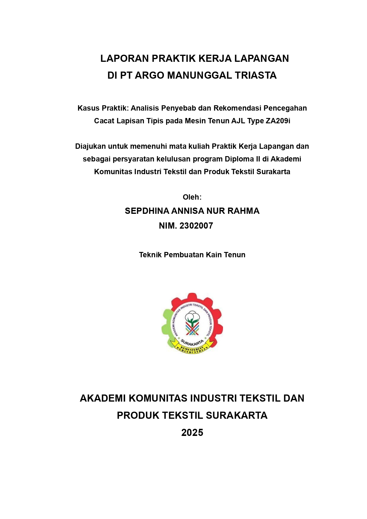 Akademi Komunitas Industri Tekstil dan Produk Tekstil Surakarta (AK- Teks Solo) adalah institusi pendidikan vokasi yang berfokus pada pengembangan dan keahlian di bidang tekstil dengan kurikulum di selaraskan dengan standar industri. Model pembelajaran mengutamakan praktik 70% dan teori 30%. Praktik kerja lapangan (PKL) dilaksanakan di bagian weaving PT Argo Manunggal Triasta (PT AMT), yang berlokasi di kota Salatiga. PKL dilaksanakan mulai dari 20 Februari 2025 sampai dengan 17 Mei 2025 dengan sistem enam hari kerja dalam satu minggu. Jumlah mesin shuttle 263 dan mesin AJL 216 dengan total karyawan non shift 111 orang dan karyawan shift 315 orang. Laporan ini membahas permasalahan teknis dalam proses sizing , yaitu nilai Size pick-up (SPU) yang tidak sesuai dengan standar berdampak pada frekuensi putus benang lusi dan penurunan efisiensi mesin tenun Air Jet Loom. SPU adalah persentase berat larutan kanji yang menempel pada benang lusi, dan nilai ini dipengaruhi oleh berbagai faktor seperti tekanan squeeze roll, konsentrasi dan viskositas larutan sizing, suhu proses, serta kecepatan mesin. Temuan dari pengamatan menunjukkan nilai SPU yang terlalu rendah menyebabkan benang tidak terlindungi dengan baik, bulu benang tetap aktif, dan lebih rentan putus saat bergesekan dengan gun, sisir, dan dropper. Sebaliknya, nilai SPU yang terlalu tinggi menyebabkan benang menjadi kaku dan getas, sehingga gagal menahan tegangan dinamis saat pembukaan lusi, memicu snapping. Kedua kondisi ekstrem SPU ini berkontribusi langsung terhadap peningkatan downtime dan penurunan efisiensi mesin. Data pengamatan dilakukan di mesin sizing BABA SANGYO KIKAY 1991 dan tujuh mesin tenun AJL dengan konstruksi kain 7095 (128x60/CD20xCD16 Twill 3/1 63"). Penanganan yang disarankan meliputi pengaturan tekanan squeeze roll sesuai karakteristik benang, pengendalian viskositas dan suhu larutan sizing secara real-time, pemilihan sizing agent yang sesuai, pelatihan teknis bagi operator, dan penerapan SOP berbasis data. Adanya kontrol SPU yang tepat, frekuensi putus benang dapat ditekan, efisiensi mesin meningkat, dan kualitas kain menjadi lebih stabil. Secara keseluruhan, laporan ini menunjukkan bahwa SPU bukan hanya parameter pelapisan, melainkan indikator kinerja produksi tenun yang sangat memengaruhi keberhasilan operasional dan mutu tekstil. Penanganan yang dilakukan pengaturan pada tekanan squeeze roll berdasarkan jenis benang dengan tekanan yang sesuai memungkinkan penetrasi sizing yang optimal. Jika terlalu rendah, perlindungan terhadap benang tidak maksimal. Jika terlalu tinggi, benang menjadi kaku. Penyesuaian tekanan membantu mengendalikan SPU secara presisi, sehingga mengurangi risiko putus benang dan memperbaiki efisiensi. Melakukan pemantauan viskositas dan suhu larutan kanji secara real-time pengontrolan suhu dan viskositas menjaga konsistensi pelapisan sizing pada benang lusi. Perubahan suhu dapat mengubah karakter larutan, mempengaruhi kekentalan dan penetrasi sizing ke dalam serat benang. pemantauan rutin membantu menjaga mutu sizing dan mencegah penyerapan size pick-up yang berlebihan. Secara keseluruhan, pengendalian SPU bukan hanya soal pelapisan, tetapi indikator penting yang berpengaruh langsung terhadap keberhasilan proses tenun, efisiensi operasional, dan mutu hasil produksi.